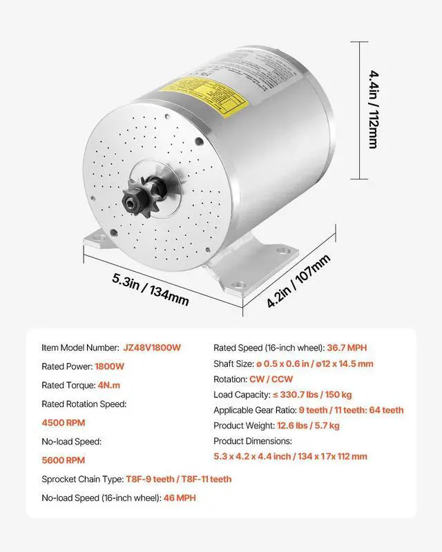Applicable Gear Ratio: 9 teeth / 11 teeth: 64 teeth,No-load Rotation Speed: 5600 RPM,Load Capacity: 330.7 lbs / 150 kg,Noise: 70 dB,Rated Rotation Speed: 4500 RPM,Item Model Number: JZ48V1800W,Product Weight: 11.5 lbs / 5.2 kg,Rated Power: 1800W,Product Dimensions: 5.3 x 4.2 x 4.4 inch / 134 x 107 x 112 mm,Rated Torque: 4N·m,Rotation: CW/CCW