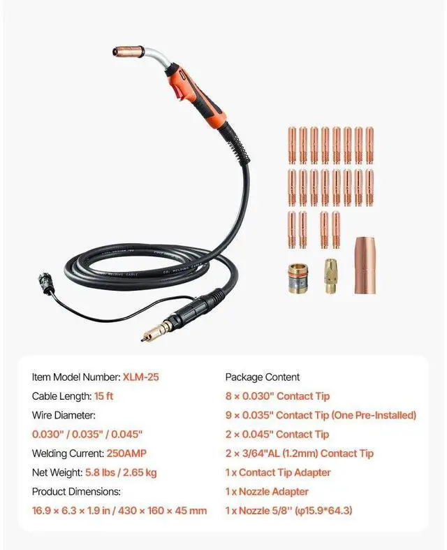 Item Model Number: XLM-25,Cable Length: 15 ft,Product Dimensions: 16.9 x 6.3 x 1.9 in / 430 x 160 x 45 mm,Net Weight: 5.8 lbs / 2.65 kg,Welding Current: 250AMP,Wire Diameter: 0.030"/0.035"/0.045"