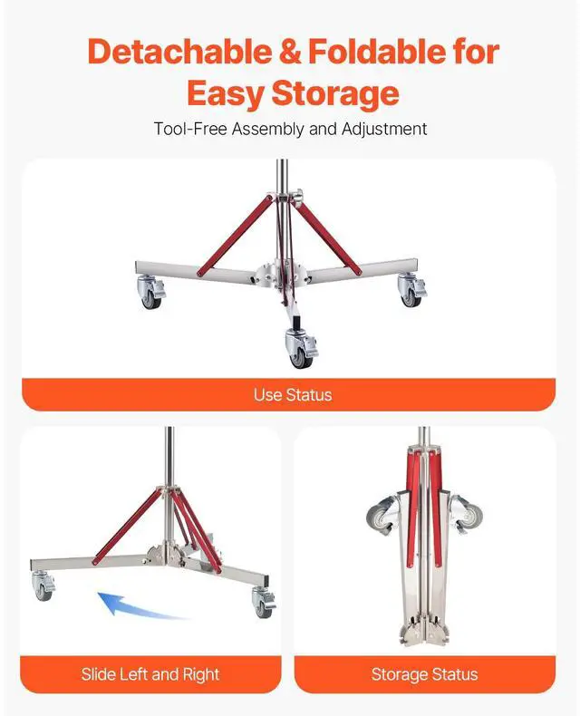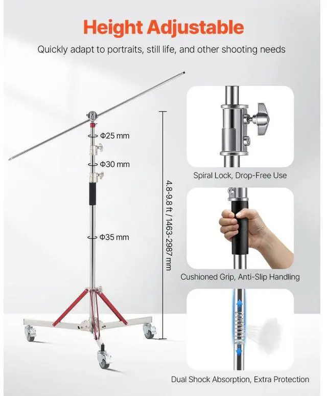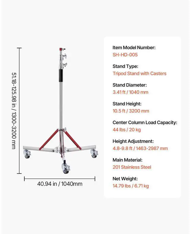 Height Adjustment: 4.8-9.8 ft / 1463-2987 mm,Stand Type: Tripod Stand with Casters,Item Model Number: SH-HD-005,Stand Diameter: 3.41 ft / 1040 mm,Center Column Load Capacity: 44 lbs / 20 kg,Product Dimensions: 40.94 x 40.94 x 51.18 in - 125.98 in / 1040 x 1040 x 1300 mm - 3200 mm,Net Weight: 14.79 lbs / 6.71 kg,Stand Height: 10.5 ft / 3200 mm,Main Material: 201 Stainless Steel