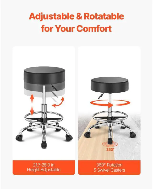 • VEVOR Round Rolling Stool Swivel Stool with Wheels & Footrest Height Adjustable