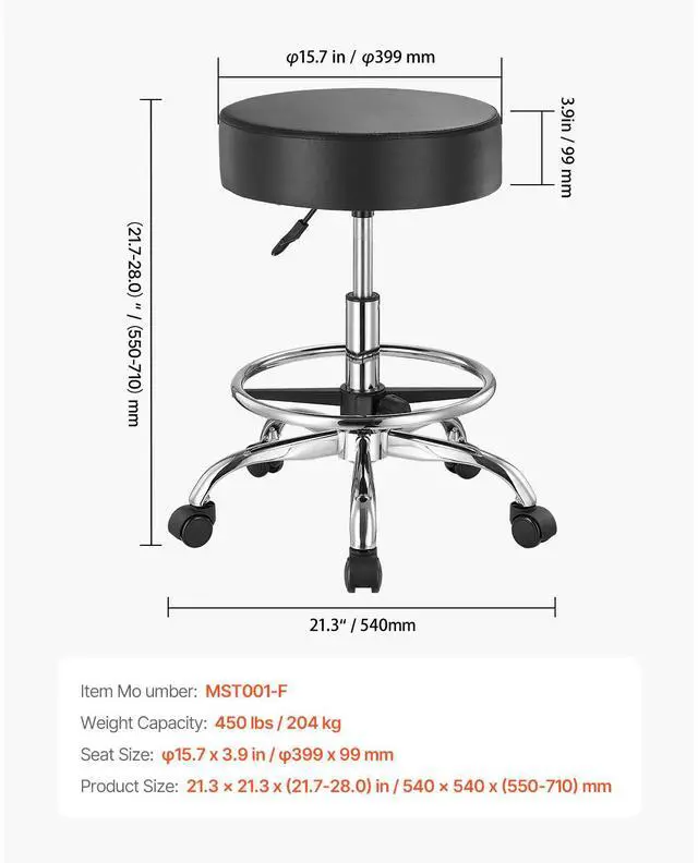 Main Materials: Leather, Sponge, Iron,Adjustable Height: 21.7-28.0 in / 55-71 cm,Seat Size: 15.7 x 3.9 in / 39.9 x 9.9 cm,Weight Capacity: 450 lbs / 204 kg,Color: Black,Item Model Number: MST001-F,Style: Counter Stool,Net Weight: 13.8 lbs / 6.25 kg,Product Size: 21.3 x 21.3 x (21.7-28.0) in / 54 x 54 x (55-71) cm