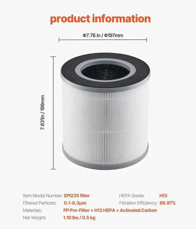 HEPA Grade: H13,Materials: PP Pre-Filter + H13 HEPA + Activated Carbon,Item Model Number: EPI235 filter,Filtered Particles: 0.1-0.3m,Product Dimensions: 7.76 x 7.83 in / 197 x 199 mm,Net Weight: 1.10 lbs / 0.5 kg,Filtration Efficiency: 99.97%