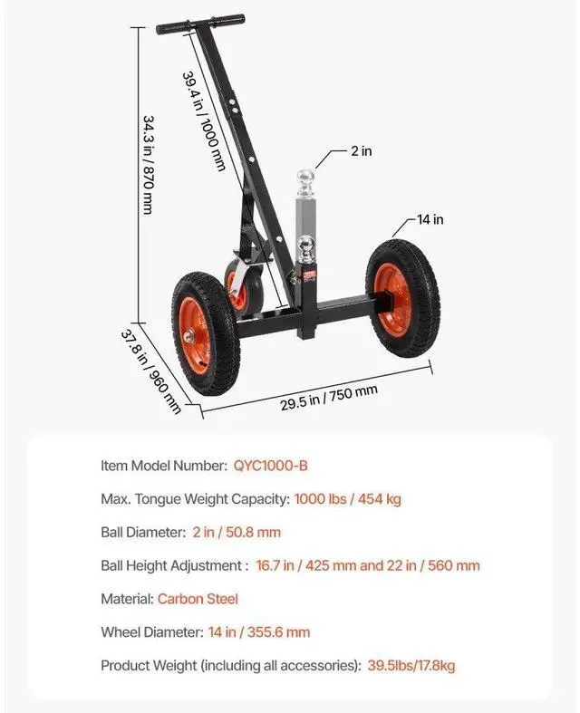 Item Model Number: QYC1000-B,Material: Carbon Steel,Wheel Diameter: 14 in / 355.6 mm,Max. Tongue Weight Capacity: 1000 lbs / 454 kg,Ball Diameter: 2 in / 50.8 mm,Ball Height Adjustment: 16.7 in / 425 mm and 22 in / 560 mm