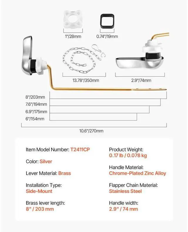 Complete Replacement Kit: This product includes a chrome-plated toilet flush handle, brass lever, stainless steel toilet chain, locking nut for installation, and a rubber washer.