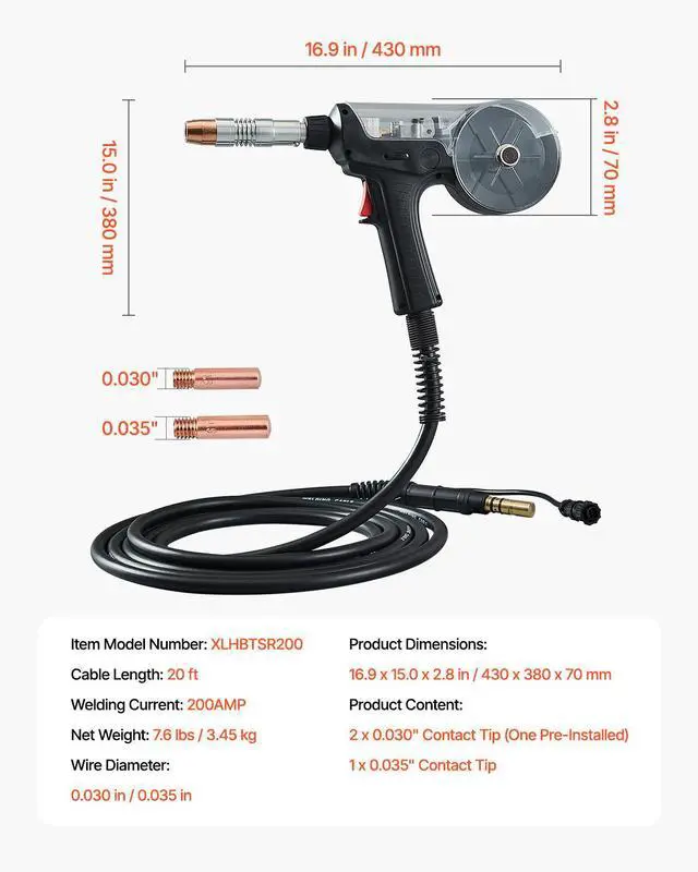 Item Model Number: XLHBTSR200,Cable Length: 20 ft ,Product Dimensions: 16.9 x15.0 x 2.8 in / 430 x 380 x 70 mm,Net Weight: 7.6 lbs / 3.45 kg ,Suitable Wire Diameter: 0.030"/0.035",Welding Current: 200AMP