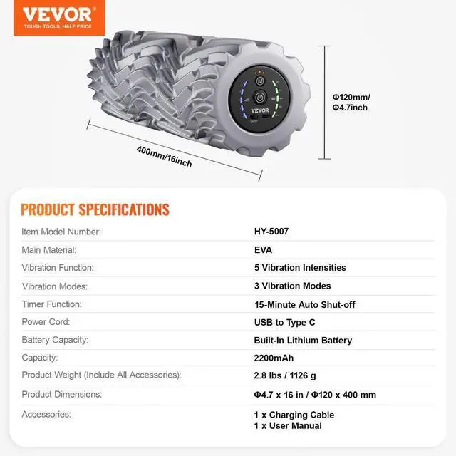 Product Weight (Include All Accessories): 2.8 lbs / 1248 g,Power Cord: USB to Type C,Capacity: 2200mAh,Battery: Built-In Lithium Battery,Item Model Number: HY-5007,Vibration Function: 5 Vibration Intensities,Vibration Modes: 3 Vibration Modes,Product Dimensions: 5 x 16 in / 120 x 400 mm,Main Material: EVA,Timer Function: 15-Minute Auto Shut-off