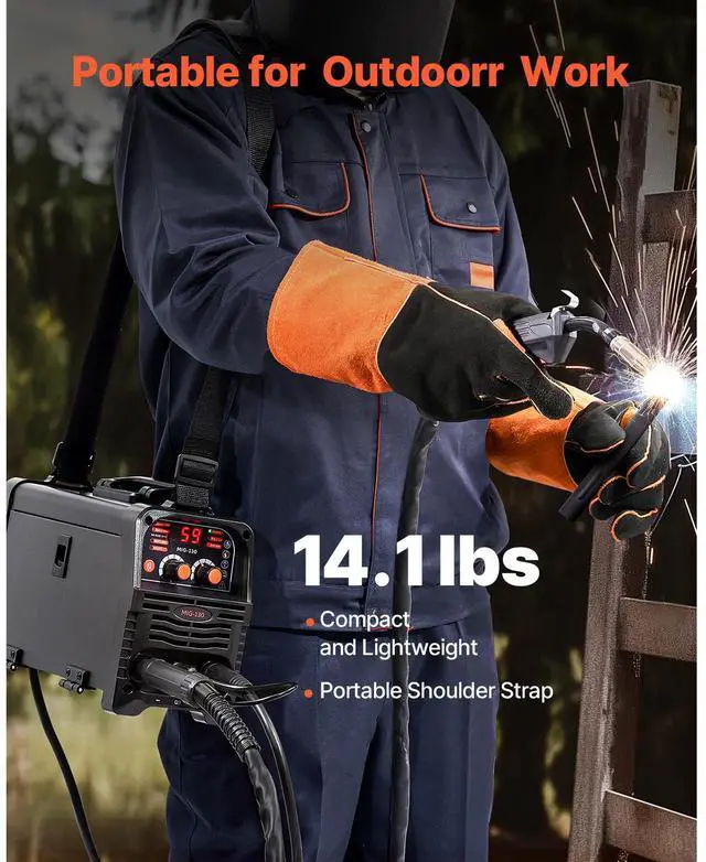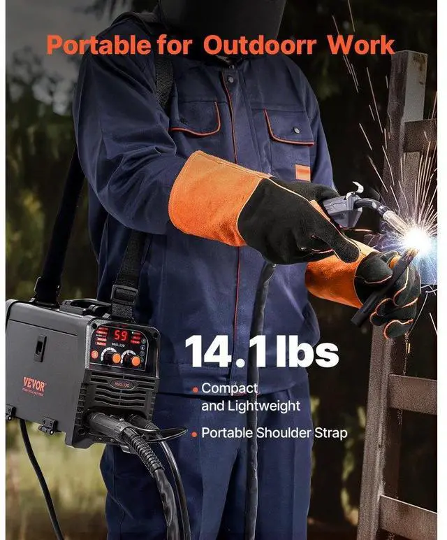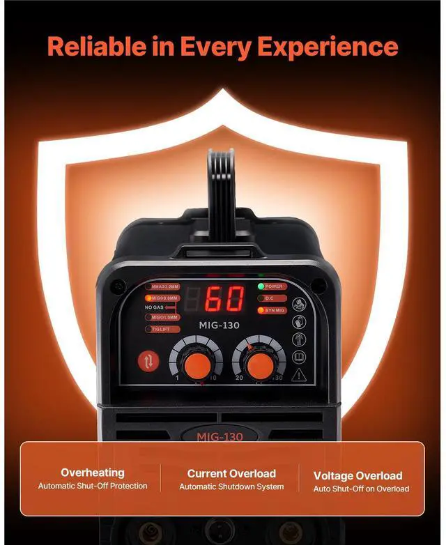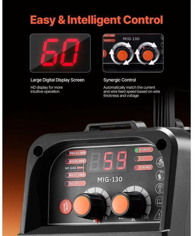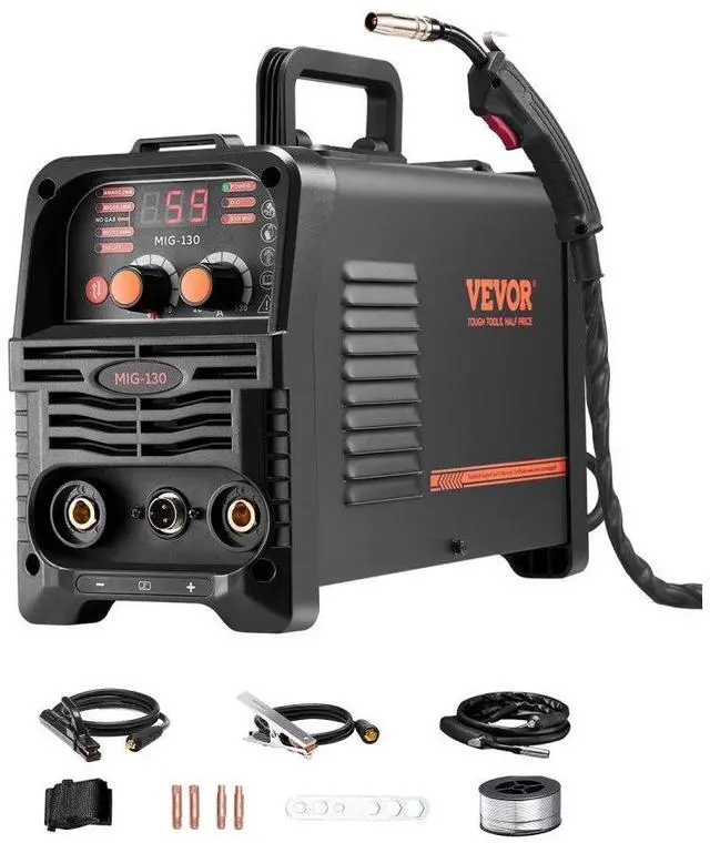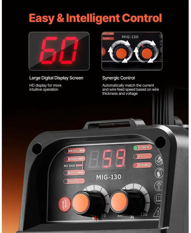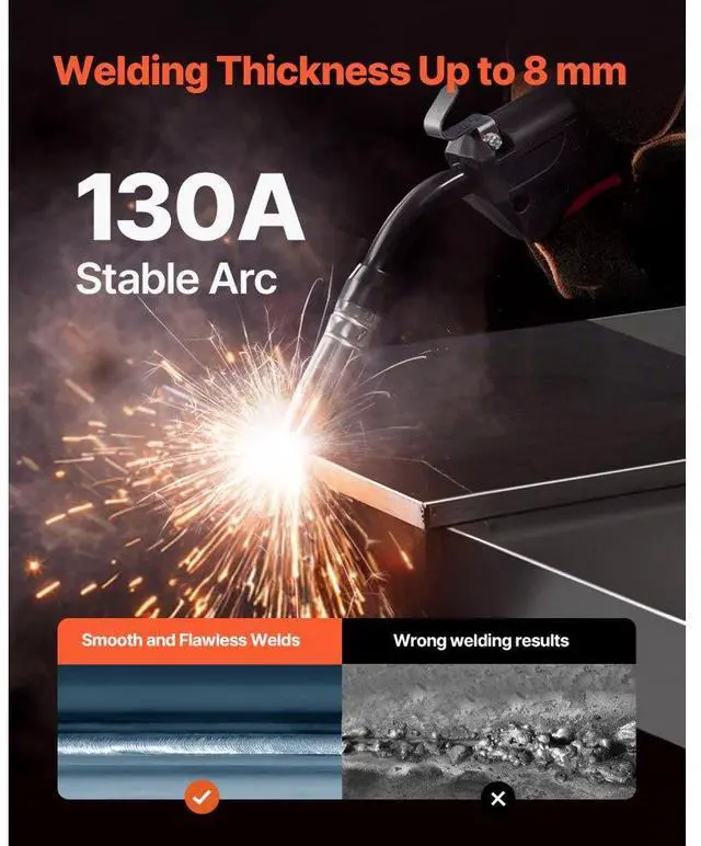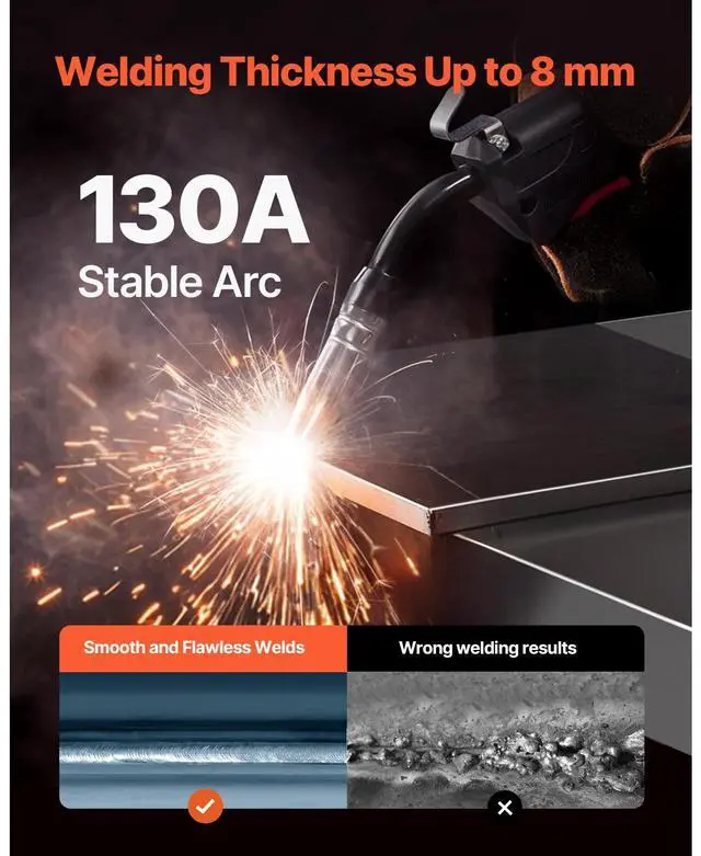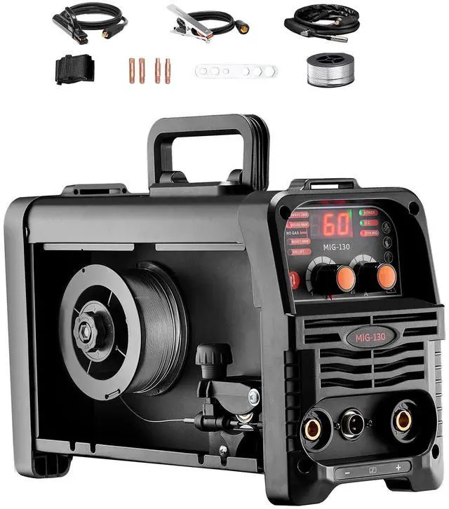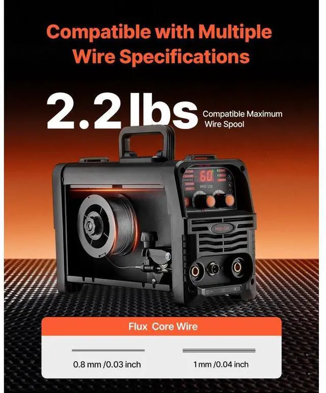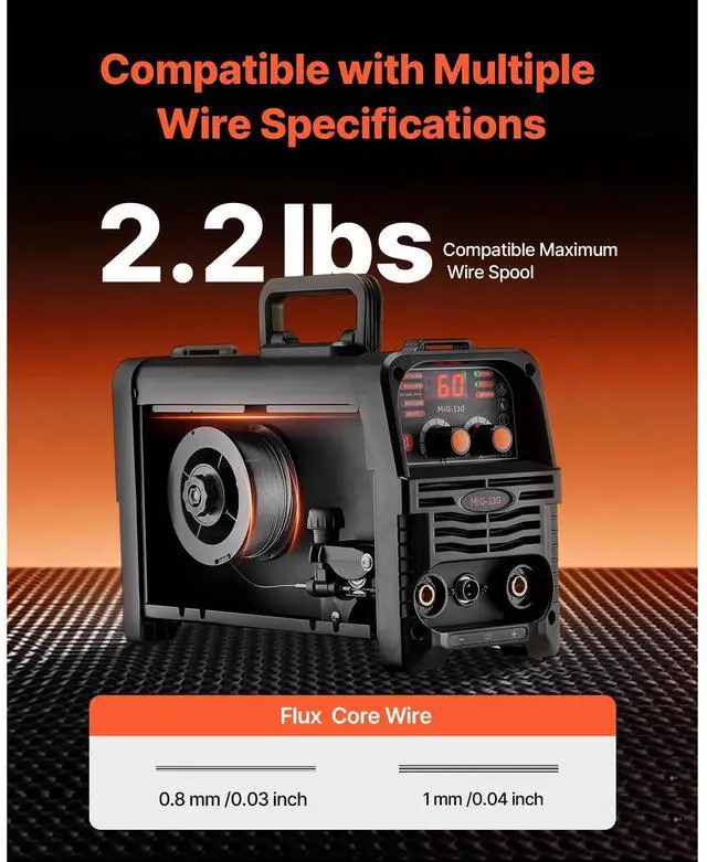 Welding Thickness: 0.31 inch ( 8 mm),Compatible Wire Type: Flux Core Wire,Compatible Maximum Wire Spool: 2.2 lbs / 1 kg,Output Current: 130A,Item Model Number: MIG-130,Product Weight: 14.1 lbs / 6.4 kg (Include All Accessories),Functions: Gasless MIG, MMA, Lift TIG,Product Dimensions: 12.6 x 5.9 x 9.8 inch / 320 x 150 x 250 mm,Input Capacity: 5.1 KVA,Compatible Wire Diameter: 0.03 inch / 0.8 mm, 0.04 inch / 1 mm