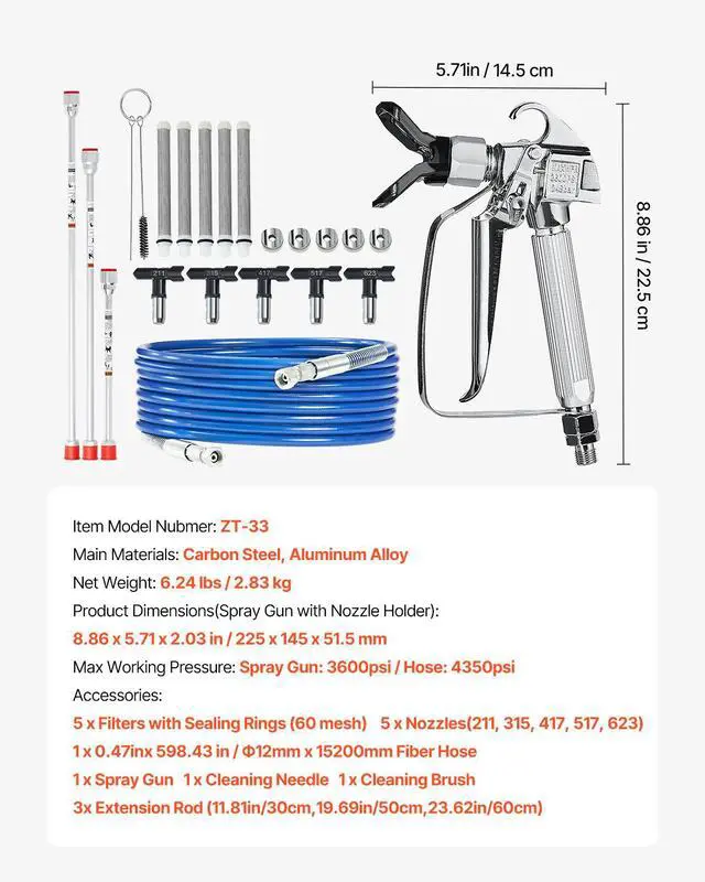 Main Materials: Carbon Steel, Aluminum Alloy,Product Dimensions (Spray Gun with Nozzle Holder): 8.86 x 5.71 x 2.03 in / 225 x 145 x 51.5 mm,Item Model Number: ZT-33,Max Working Pressure: Spray Gun: 3600psi / Hose: 4350psi,Net Weight: 6.24 lbs / 2.83 kg