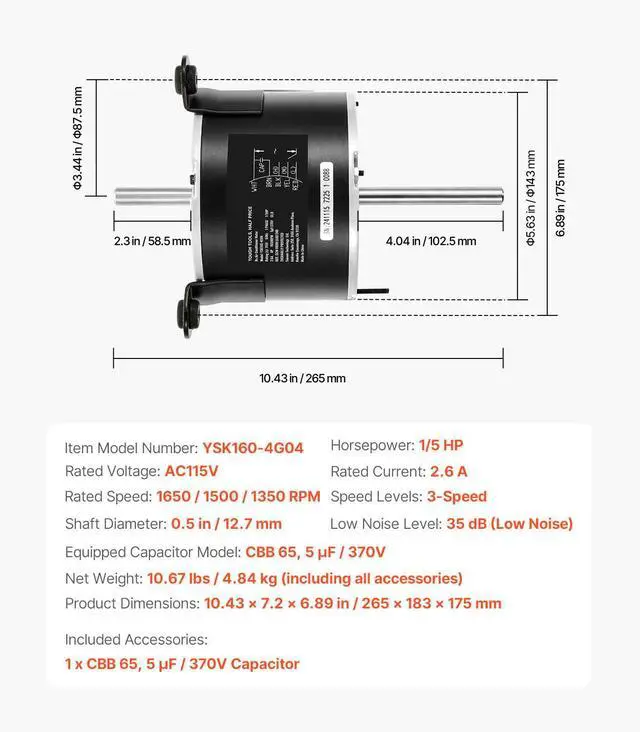 Equipped Capacitor Model: CBB 65, 5 µF / 370V,Rated Speed: 1650 / 1500 / 1350 RPM,Horsepower: 1/5 HP,Item Model Number: YSK160-4G04,Shaft Diameter: 0.5 in / 12.7 mm,Rated Current: 2.6 A,Speed Levels: 3-Speed,Product Dimensions: 10.43 x 7.2 x 6.89 inch / 265 x 183 x 175 mm,Net Weight: 10.67 lbs / 4.84 kg (including all accessories),Rated Voltage: AC115V