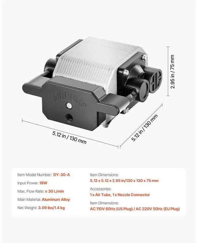 Input Power: 18W,Max. Flow Rate: 30 L/min,Voltage Frequency: AC 110V 60Hz (US Plug)/AC 220V 50Hz (EU Plug),Item Model Number: DY-30-A,Item Dimensions: 5.12 x 5.12 x 2.95 in/130 x 130 x 75 mm,Net Weight: 3.09 lbs/1.4 kg,Main Material: Aluminum Alloy,Max. Noise: 45 dB
