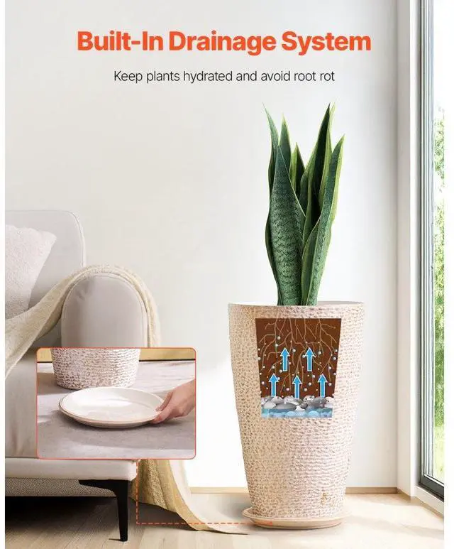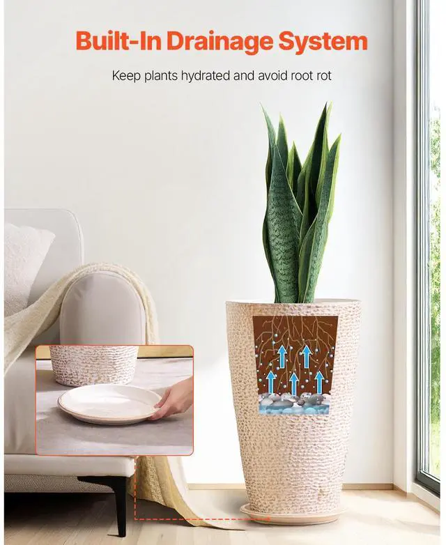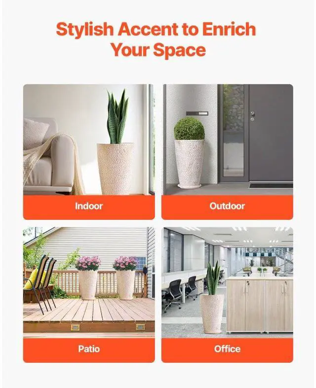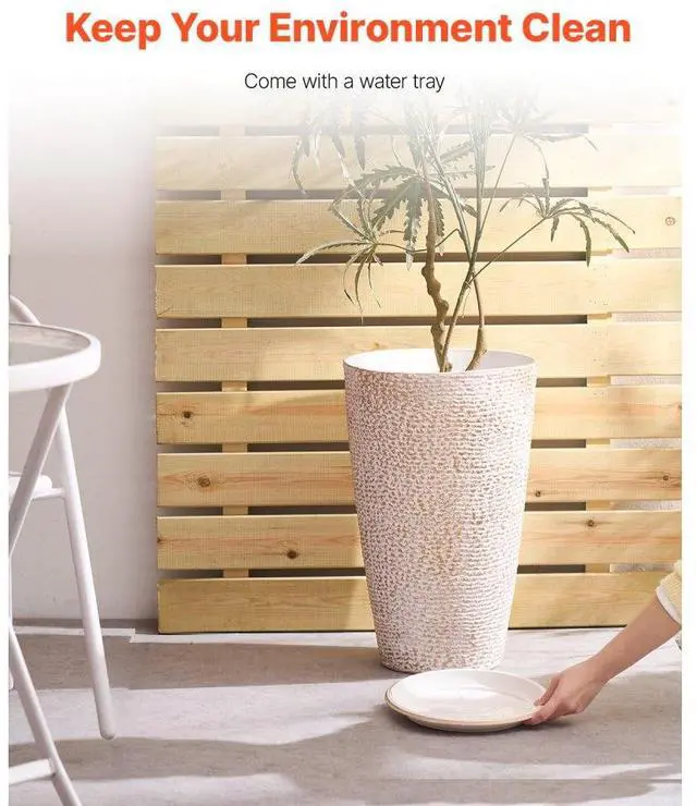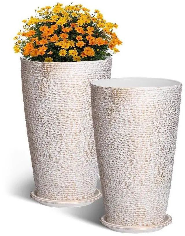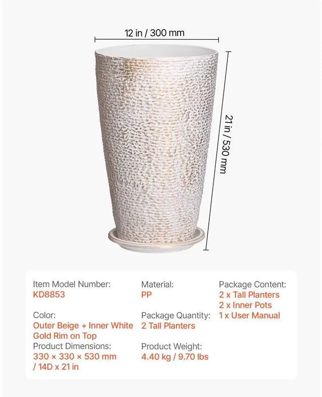 Color: Outer Beige + Gold Rim on Top + Inner White,Item Model Number: KD8853,Product Weight: 4.40 kg / 9.70 lbs,Material: PP,Package Quantity: 2 Tall Planters,Product Dimensions: 330 x 330 x 530 mm / 14D x 21 inches