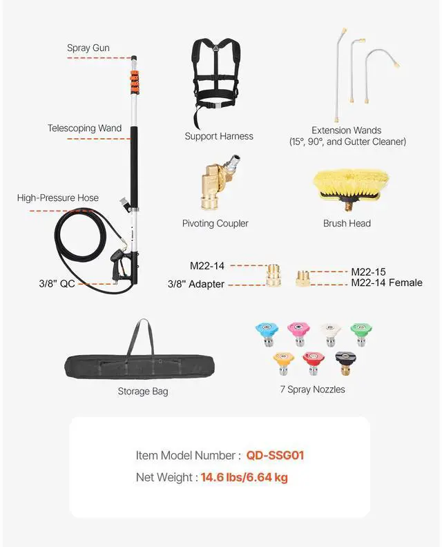 Length: 20.86 ft/6358 mm,Product Dimensions (No Extension, No Extension Wand): 6.9 x 1.8 x 54.8 in/175 x 45 x 1393 mm,Item Model Number: QD-SSG01,Compatible Water Pressure: 4000 psi/275 bar,Net Weight: 14.6 lbs/6.64 kg