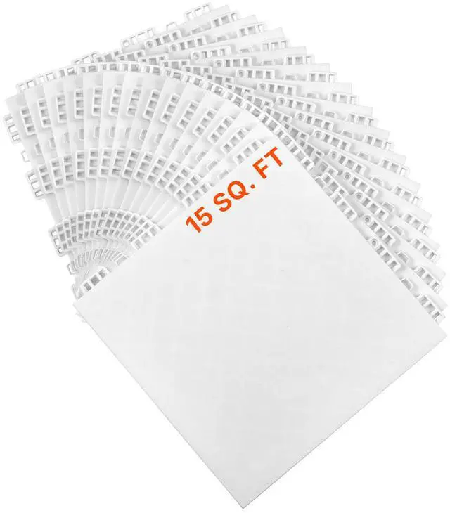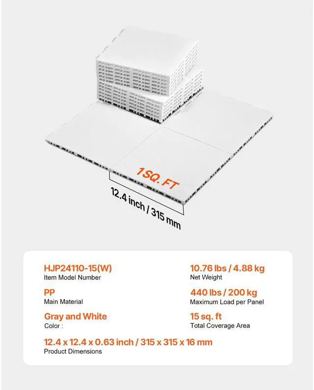 Total Coverage Area: 15 sq. ft,Color: Gray and White,Item Model Number: HJP24110-15 (W),Maximum Load per Panel: 440 lbs / 200 kg,Quantity: 15 pcs,Product Dimensions: 12.4 x 12.4 x 0.63 inch / 315 x 315 x 16 mm,Net Weight: 10.76 lbs / 4.88 kg,Main Material: PP
