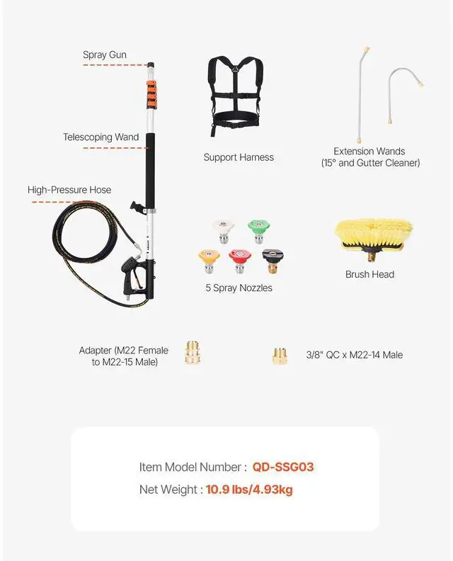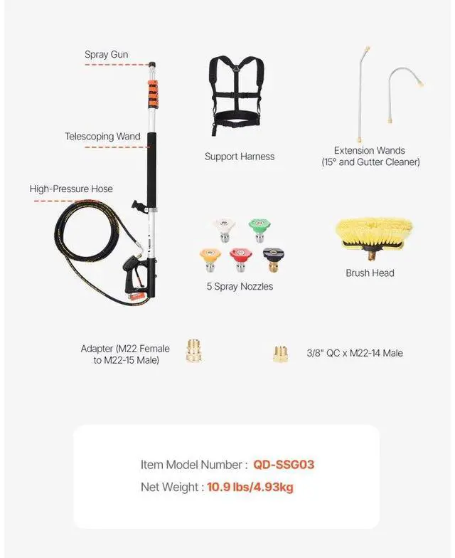 Length: 17.84 ft/5437 mm,Product Dimensions (No Extension, No Extension Wand): 6.9 x 2.4 x 54.8 in/175 x 60 x 1393 mm,Item Model Number: QD-SSG03,Compatible Water Pressure: 4000 psi/275 bar,Net Weight: 10.9 lbs/4.93kg