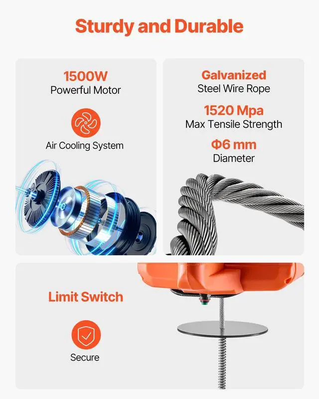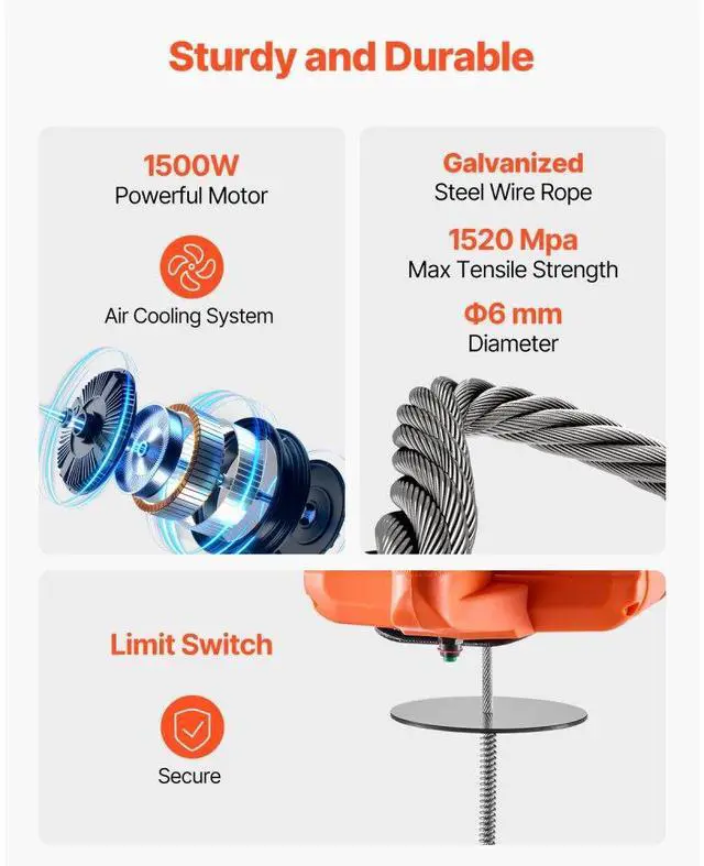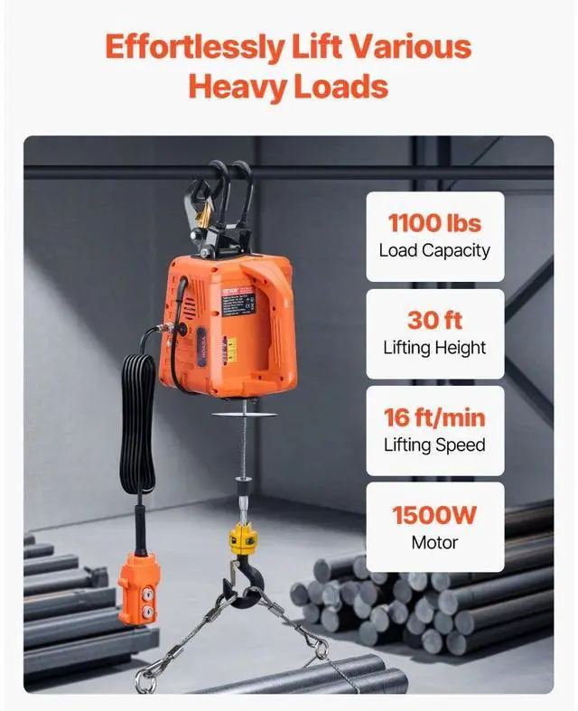Lifting Speed: 16 ft/min (4 m/min),Control Mode: Manual, Wired, Wireless,Lifting Height: 30 ft / 9.1 m,Main Materials: Carbon Steel, Cast Aluminum, Nylon,Lifting Capacity: 1100 lbs / 500 kg,Item Model Number: 500-D2,(*Power cord and motor configuration based on local specifications):,Net Weight: 23.04 lbs / 10.45 kg (including all accessories),Product Size: 7.87 x 8.66 x 7.87 in / 200 x 220 x 200 mm (excluding hook and rope)
