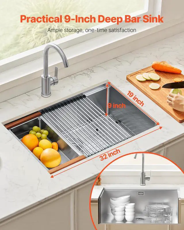 32" Kitchen Sink Undermount Single Bowl Drop-In Basin Stainless Steel Bar