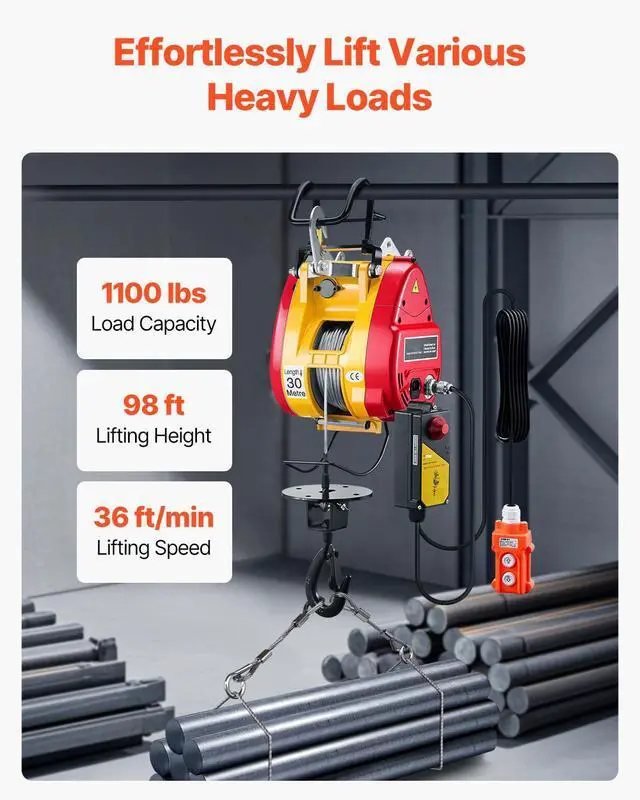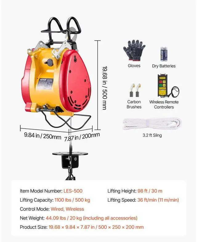 Lifting Speed: 36 ft/min (11 m/min),Control Mode: Wired, Wireless,Lifting Height: 98 ft / 30 m,Lifting Capacity: 1100 lbs / 500 kg,Item Model Number: LES-500,Product Dimensions: 19.68 x 9.84 x 7.87 in / 500 x 250 x 200 mm,Net Weight: 44.09 lbs / 20 kg (including all accessories)