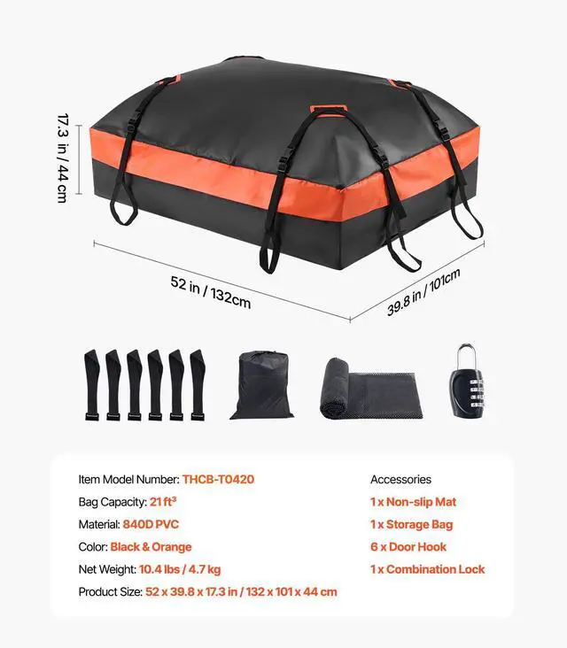 Color: Black & Orange,Item Model Number: THCB-T0420,Material: 840D PVC,Bag Capacity: 21 Cubic Feet,Net Weight: 10.4 lbs / 4.7 kg,Product Size: 52 x 39.8 x 17.3 in / 132 x 101 x 44 cm