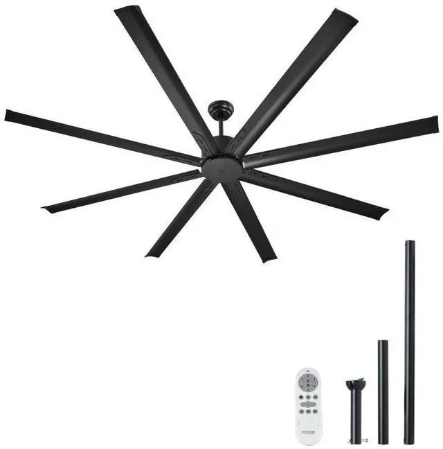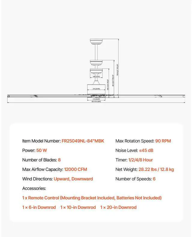 Product Dimensions(10-in Downrod): 84.25 x 17.79"/2140 x 451.8 mm,Product Dimensions(20-in Downrod): 84.25 x 27.79"/2140 x 705.8 mm,Color: Black,Max Airflow Capacity: 12000 CFM,Product Dimensions(6-in Downrod): 84.25 x 13.79"/2140 x 350.2 mm,Number of Speeds: 6,Wind Directions: Upward, Downward,Noise Level: 45 dB,Timer: 1/2/4/8 Hour,Max Rotation Speed: 90 RPM,Item Model Number: FR25049NL-84"MBK,Number of Blades: 8,Net Weight: 28.22 lbs / 12.8 kg,Power: 53 W