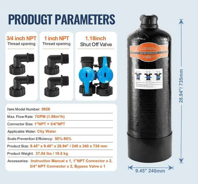 Connector Size: 1" + 3/4",Applicable Water: City Water,Max. Flow Rate: 7 GPM (1.59 m³/h),Scale Prevention Efficiency: 50%-90%,Item Model Number: 0926,Product Weight: 37.04 lbs / 16.8 kg,Product Size: 9.45" x 9.45" x 28.94" / 240 x 240 x 735 mm