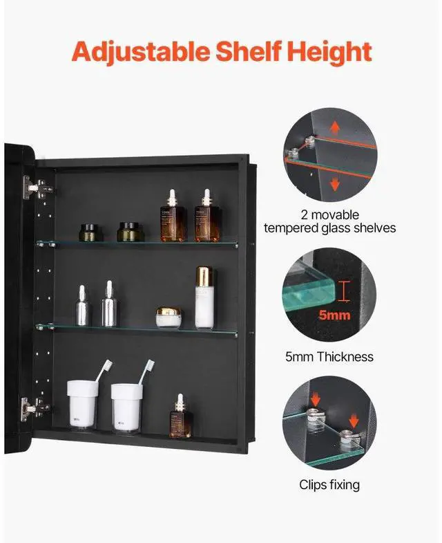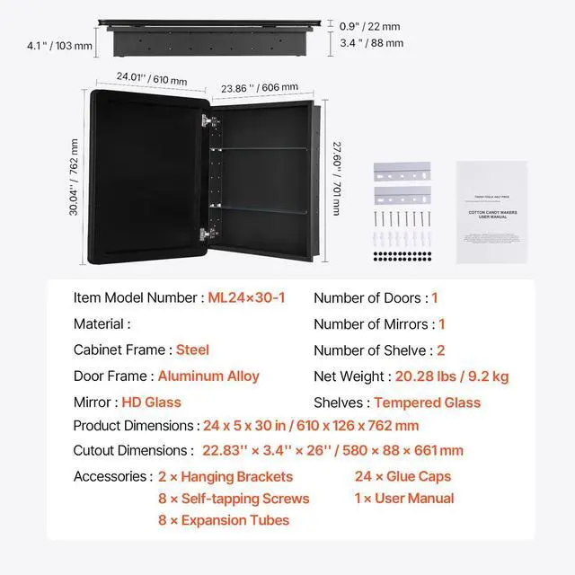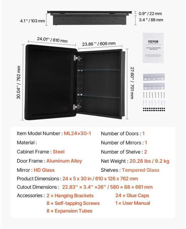 Number of Shelves: 2,Cabinet Frame: Steel,Shelves: Tempered Glass,Product Model: ML24×30-1,Number of Doors: 1,Material:,Door Frame: Aluminum Alloy,Product Dimensions: 24 x 5 x 30 in / 610 x 126 x 762 mm,Mirror: HD Glass,Net Weight: 20.28 lbs / 9.2 kg,Number of Mirrors: 1