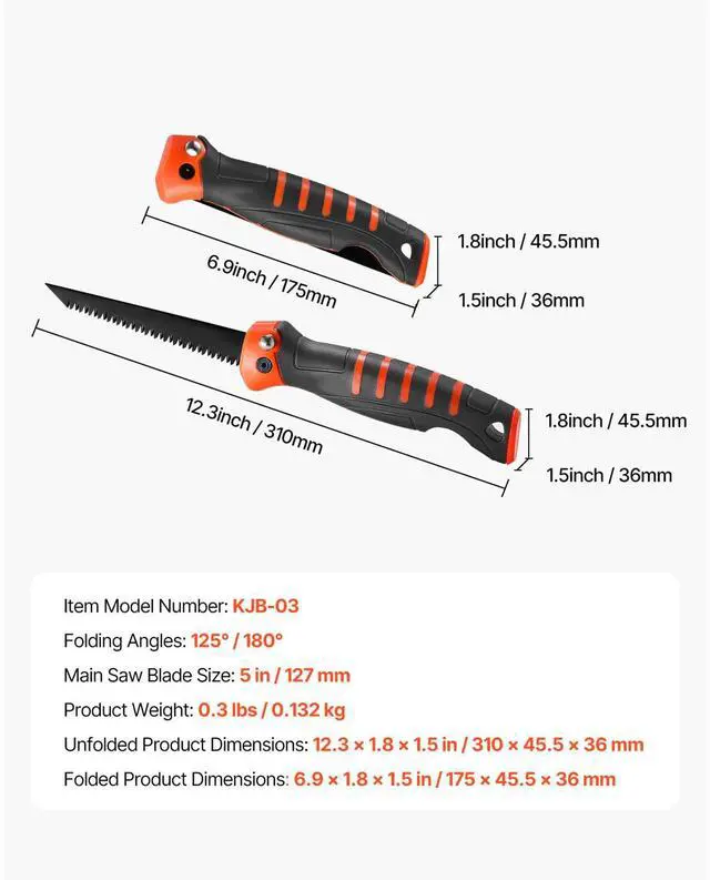 Main Saw Blade Size: 5 in / 127 mm,Folding Angles: 125° / 180°,Folded Product Dimensions: 6.9 x 1.8 x 1.5 in / 175 x 45.5 x 36 mm,Unfolded Product Dimensions: 12.3 x 1.8 x 1.5 in / 310 x 45.5 x 36 mm,Item Model Number: KJB-03,Product Weight: 0.3 lbs / 0.132 kg