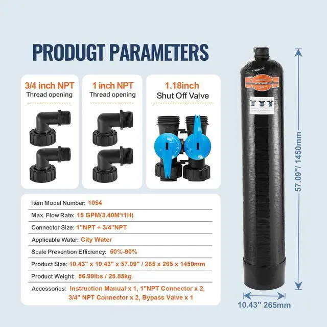 Connector Size: 1" + 3/4",Applicable Water: City Water,Max. Flow Rate: 15 GPM (3.4 m³/h),Scale Prevention Efficiency: 50%-90%,Item Model Number: 1054,Product Weight: 56.99 lbs / 25.85 kg,Product Size: 10.43" x 10.43" x 57.09" / 265 x 265 x 1450 mm
