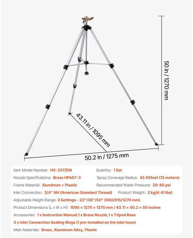 Nozzle Specifications: Brass HPb57-3,Main Materials: Brass, Aluminum Alloy, Plastic,Adjustable Height Range: 3 Settings - 22"/36"/50" (560/915/1270 mm),Inlet Connection: 3/4" NH (American Standard Thread),Item Model Number: HX-3317DN,Product Weight: 2 kg (4.41 lbs),Quantity: 1 Set,Frame Material: Aluminum + Plastic; Rubber Coating: Rubber-Plastic; Plastic: ABS, PA, PP,Recommended Water Pressure: 20-80 psi,Product Dimensions (L x W x H): 1095 x 1275 x 1270 mm / 43.11 x 50.2 x 50 inches,Spray Coverage Radius: 42 ft (13 meters)