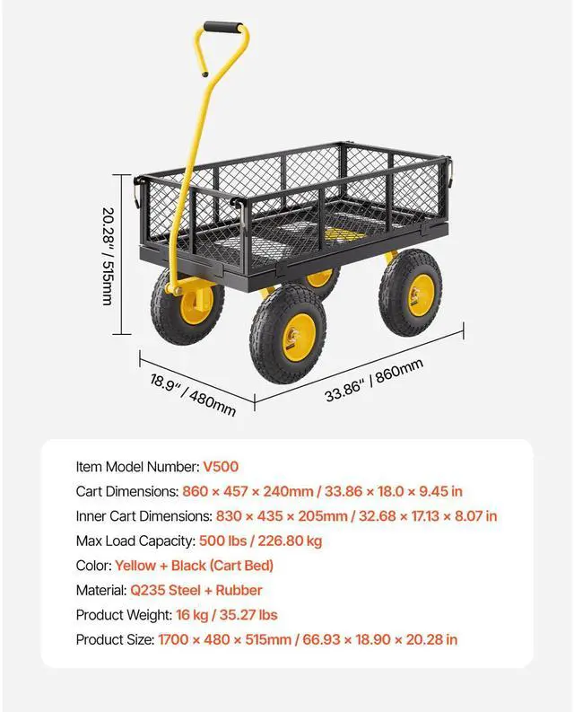 Cart Dimensions: 860 x 457 x 240mm / 33.86 x 18.0 x 9.45 inches,Inner Cart Dimensions: 830 x 435 x 205mm / 32.68 x 17.13 x 8.07 inches,Color: Yellow + Black,Item Model Number: V500,Product Weight: 16 kg / 35.27 lbs,Max Load Capacity: 500 lbs / 226.80 kg,Material: Q235 Steel + Rubber,Product Size: 1700 x 480 x 515mm / 66.93 x 18.90 x 20.28 inches