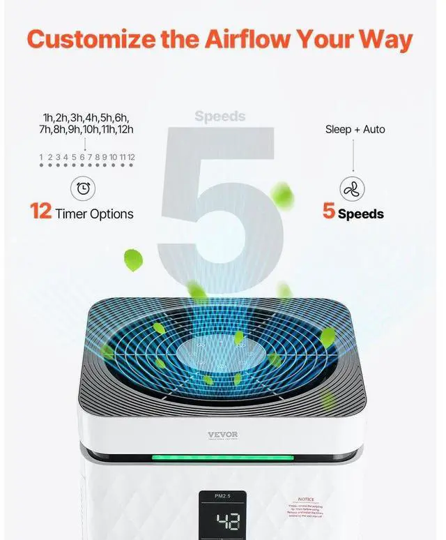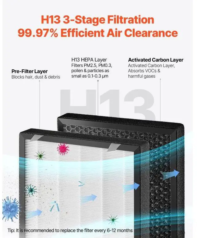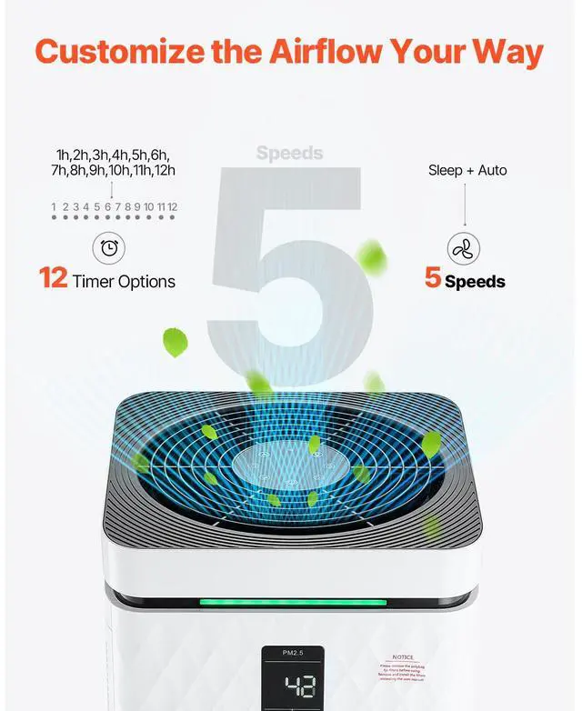 HEPA Grade: H13,CADR Value: 700 m³/h,12 Timer Settings: 1h, 2h, 3h, 4h, 5h, 6h, 7h, 8h, 9h, 10h, 11h, 12h,Item Model Number: KJ800F-A04,Product Dimensions: 13.94 x 14.09 x 27.68 in / 354 x 358 x 703 mm,Coverage Area (1 Hour): 3139 ft²,Sleep Noise: 23dB,Net Weight: 28.21 lbs / 12.8 kg,Power: 80W