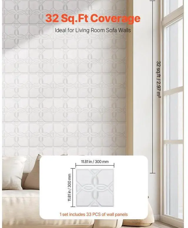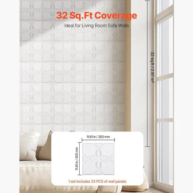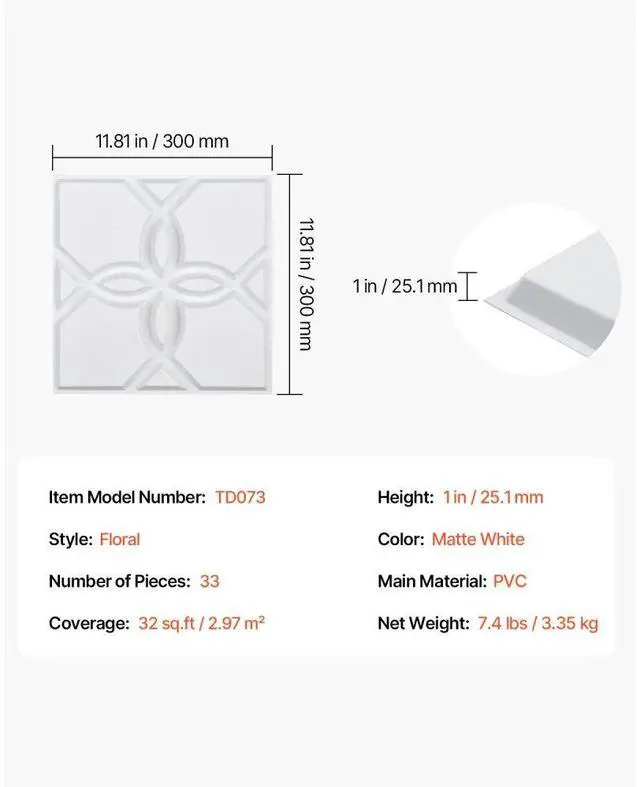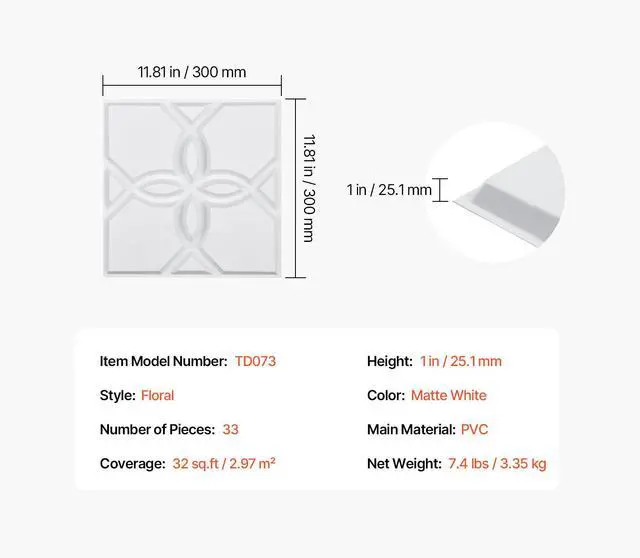 Number of Pieces: 33,Color: Matte White,Item Model Number: TD073,Style: Floral,Coverage: 32 sq.ft / 2.97 m²,Height: 1 in / 25.1 mm,Product Dimensions(L x W x H): 11.81 x 11.81 x 1 in / 300 x 300 x 25.1 mm,Net Weight: 7.4 lbs / 3.35 kg,Main Material: PVC