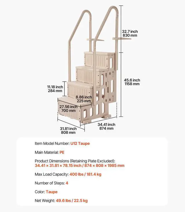 Product Dimensions (Retaining Plate Excluded): 34.41 x 31.81 x 78.15 inch / 874 x 808 x 1985 mm,Number of Steps: 4,Color: Taupe,Item Model Number: U12 taupe,Max Load Capacity: 400 lbs / 181.4 kg,Net Weight: 49.6 lbs / 22.5 kg,Main Material: PE