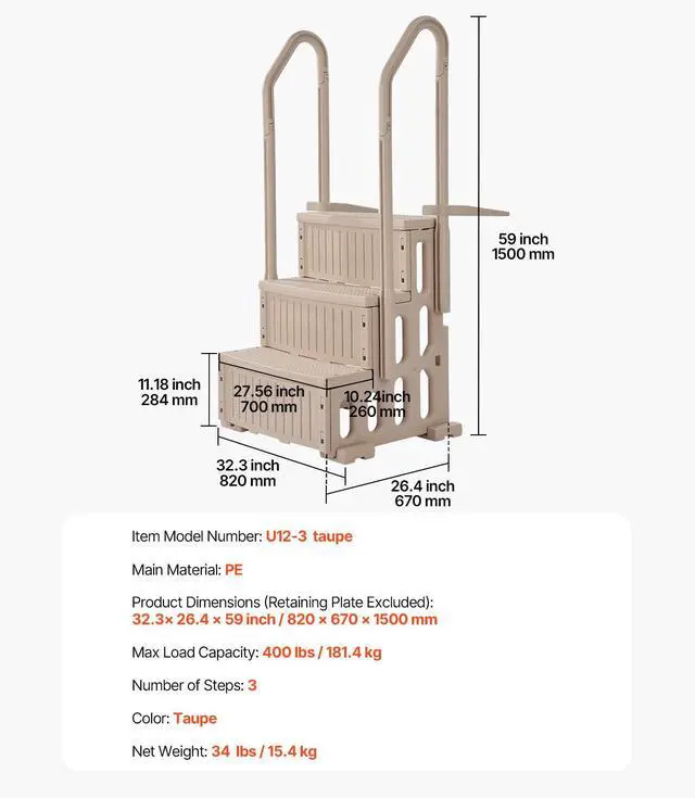 Product Dimensions (Retaining Plate Excluded): 59 x 32.3 x 26.4 inch / 1500 x 820 x 670 mm,Number of Steps: 3,Color: Taupe,Item Model Number: U12-3 taupe,Max Load Capacity: 400 lbs / 181.4 kg,Net Weight: 34 lbs / 15.4 kg,Main Material: PE