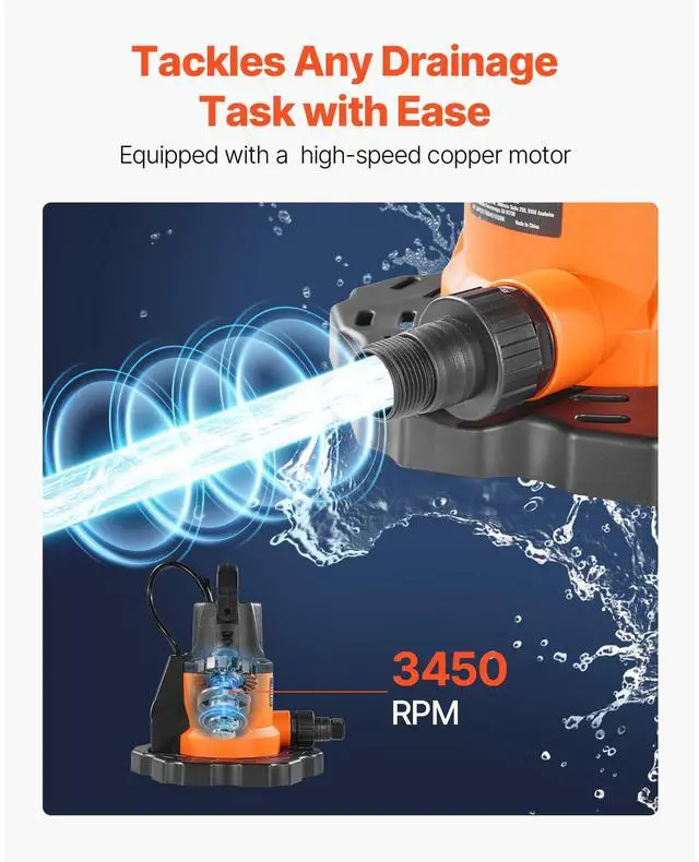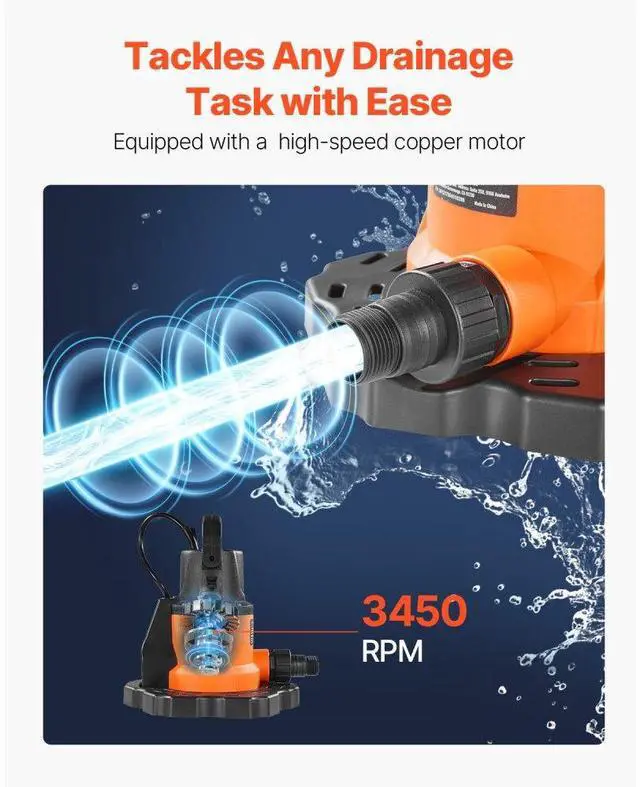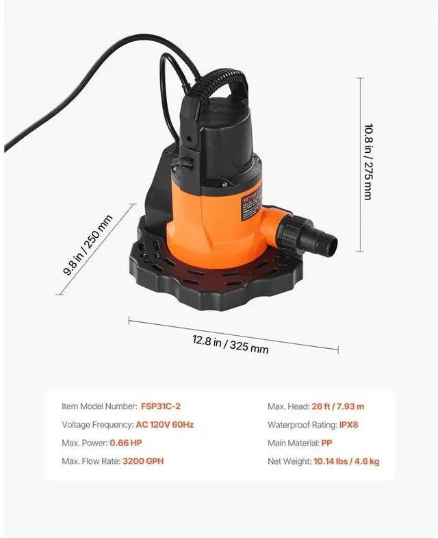 Max. Head: 26 ft / 7.93 m,Waterproof Rating: IPX8,Max. Flow Rate: 3200 GPH,Voltage Frequency: AC 120V 60Hz,Item Model Number: FSP31C-2,Max. Power: 0.66 HP,Main Material: PP