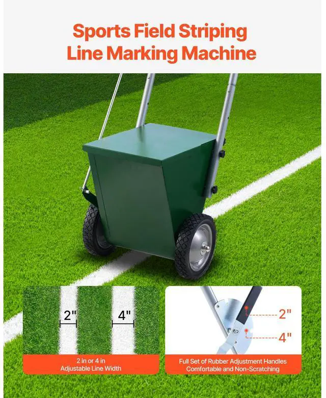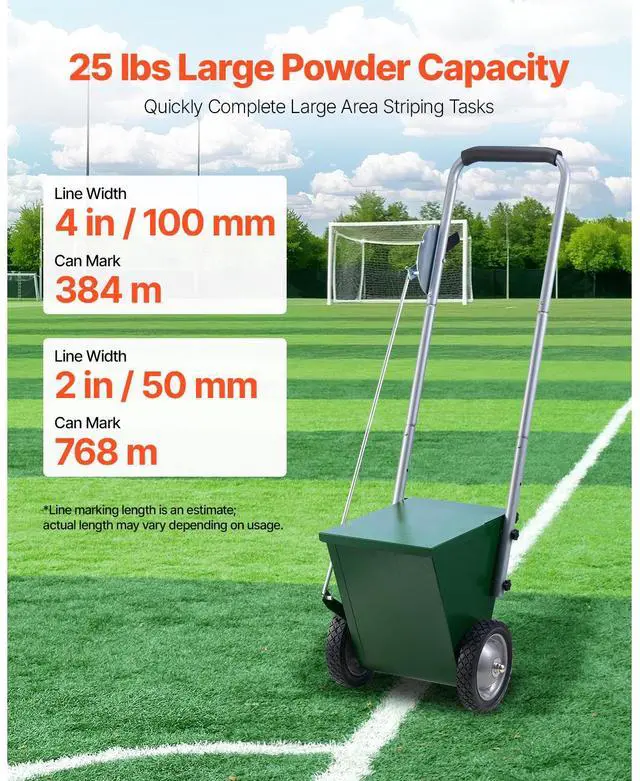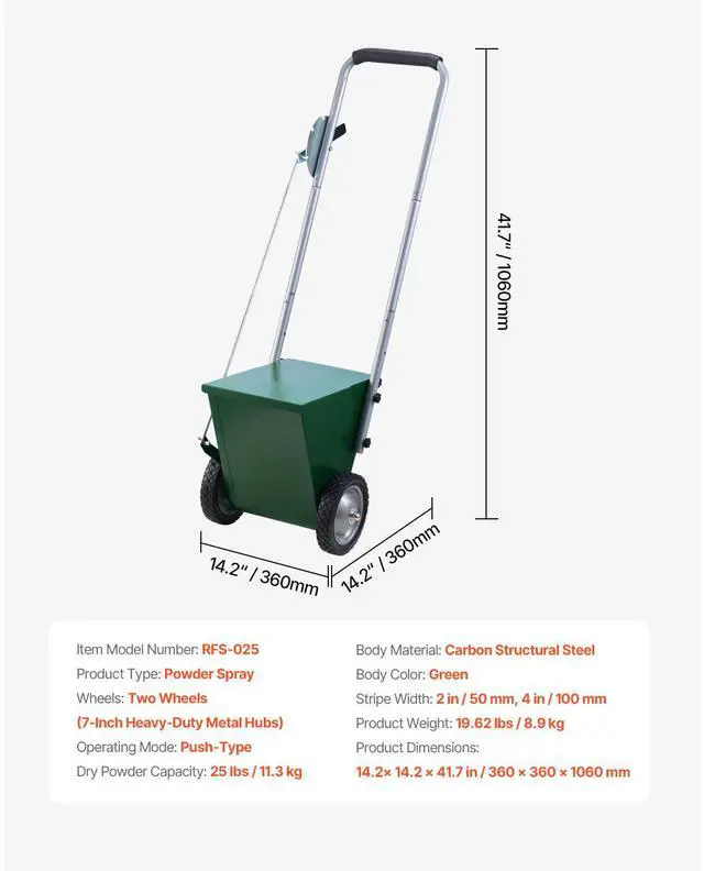 Body Material: Carbon Structural Steel,Product Type: Powder Spray,Wheels: Two Wheels (7-Inch Heavy-Duty Metal Hubs),Body Color: Green,Item Model Number: RFS-025,Product Weight: 19.62 lbs / 8.9 kg,Operating Mode: Push-Type,Product Dimensions (L x W x H): 14.2 x 14.2 x 14.6 in / 360 x 360 x 370 mm,Stripe Width: 2 in / 50 mm, 4 in / 100 mm,Dry Powder Capacity: 25 lbs / 11.3 kg