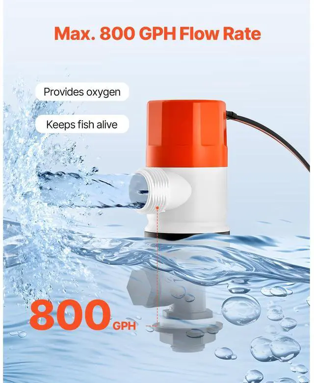 Livewell Pump for Boat 12V 800 GPH Livewell Aerator Pump Straight 2 Inlets
