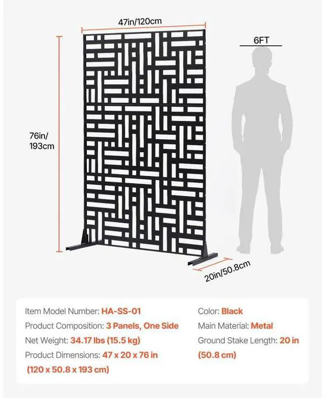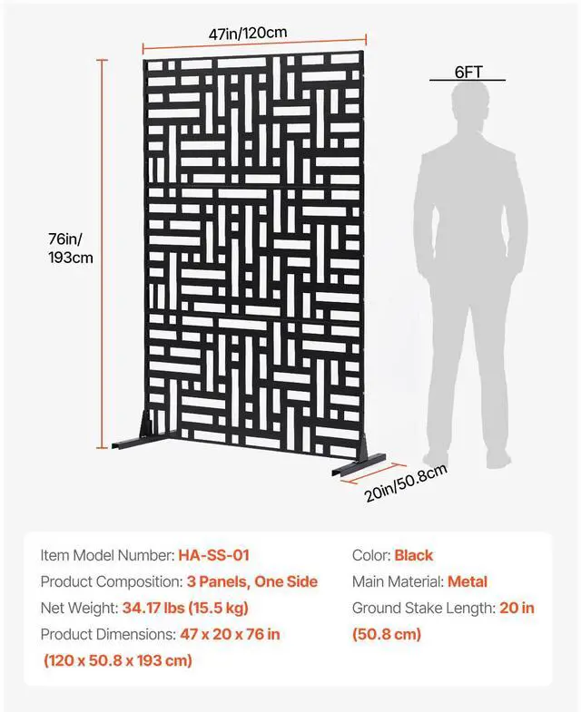 Color: Black,Item Model Number: HA-SS-01,Ground Stake Length: 20 in (50.8 cm),Product Composition: 3 Panels, One Side,Product Dimensions: 47 x 20 x 76 in (120 x 50.8 x 193 cm),Net Weight: 34.17 lbs (15.5 kg),Main Material: Metal