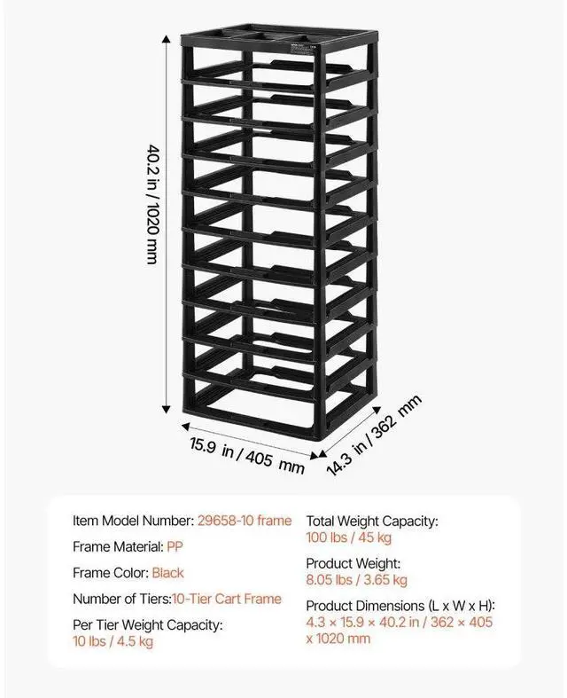 Frame Color: Black,Total Weight Capacity: 100 lbs / 45 kg,Number of Tiers: 10-Tier Cart Frame,Item Model Number: 29658-10 frame,Product Weight: 8.05 lbs / 3.65 kg,Frame Material: PP,Product Dimensions (L x W x H): 14.3 x 15.9 x 40.2 in / 362 x 405 x 1020 mm,Per Tier Weight Capacity: 10 lbs / 4.5 kg