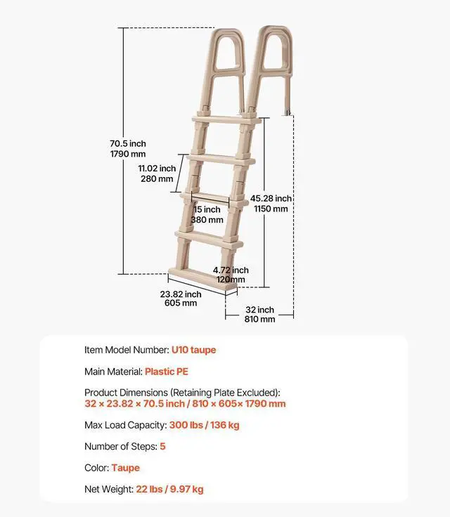 Product Dimensions(Mounting Base Excluded): 32 x 23.82 x 70.5 inch / 810 x 605 x 1790 mm,Number of Steps: 5,Color: Taupe,Item Model Number:U10 taupe,Max Load Capacity: 300 lbs / 136 kg,Net Weight: 22 lbs / 9.97 kg,Main Material: Plastic PE