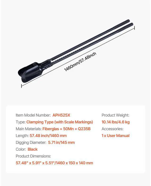 Digging Diameter: 5.71 in/145 mm,Type: Clamping Type (with Scale Markings),Main Materials: Fiberglas + 50Mn + Q235B,Length: 57.48 inch/1460 mm,Color: Black,Item Model Number: APH525X,Product Weight: 10.14 lbs/4.6 kg,Product Dimensions: 57.48" x 5.91" x 5.51"/1460 x 150 x 141 mm