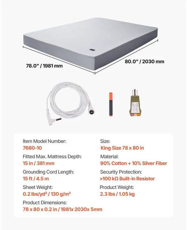 Grounding Cord Length: 15 ft / 4.5 m,Size: King Size 78 x 80 in,Item Model Number: 7680-10,Product Weight: 2.3 lbs / 1.05 kg,Sheet Weight: 0.2 lbs/yd² / 130 g/m²,Material: 90% Cotton + 10% Silver Fiber,Security Protection: 100 k Built-in Resistor,Fitted Max. Mattress Depth: 15 in / 381 mm