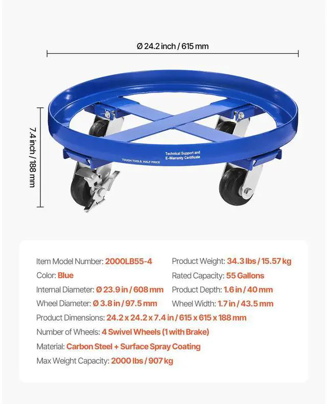 Rated Capacity: 55 Gallons,Max Weight Capacity: 2000 lbs / 907 kg,Color: Blue,Item Model Number: 2000LB55-4,Product Weight: 34.3 lbs / 15.57 kg,Material: Carbon Steel + Surface Spray Coating,Wheel Diameter: Ø 3.8 in / 97.5 mm,Number of Wheels: 4 Swivel Wheels (1 with Brake),Product Dimensions: 24.2 x 24.2 x 7.4 in / 615 x 615 x 188 mm,Product Depth: 1.6 in / 40 mm,Internal Diameter: Ø 23.9 in / 608 mm,Wheel Width: 1.7 in / 43.5 mm
