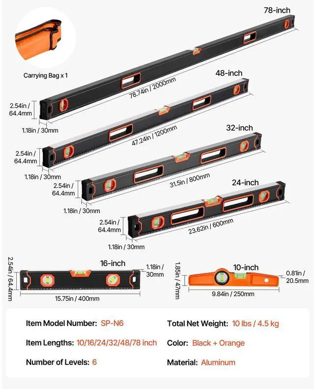 Item Dimensions(78-inch level): 78.74 x 1.18 x 2.56 inch / 2000 x 30 x 65 mm,Item Dimensions(16-inch level): 15.75 x 1.18 x 2.54 inch / 400 x 30 x 64.4 mm,Item Dimensions(48-inch level): 47.24 x 1.18 x 2.54 inch / 1200 x 30 x 64.4 mm,Total Net Weight: 10 lbs / 4.5 kg,Item Dimensions(24-inch level): 23.62 x 1.18 x 2.5 inch / 600 x 30 x 63.4 mm,Color: Black + Orange,Item Model Number: SP-N6,Item Dimensions(32-inch level): 31.5 x 1.18 x 2.5 inch / 800 x 30 x 63.4 mm,Material: Aluminum,Item Dimensions(10-inch level): 9.84 x 0.81 x 1.85 inch / 250 x 20.5 x 47 mm,Item Lengths: 10/16/24/32/48/78 inch,Number of Levels: 6