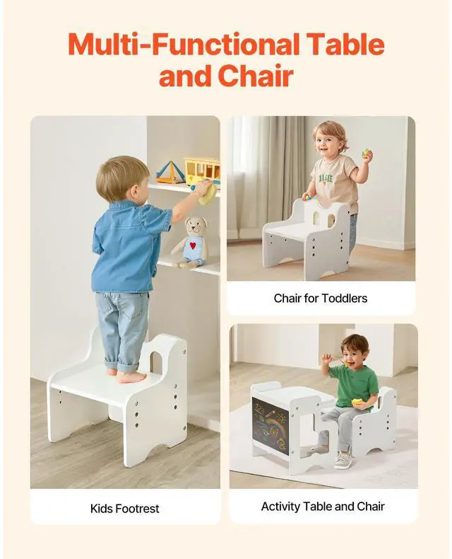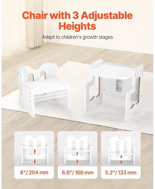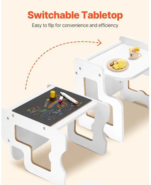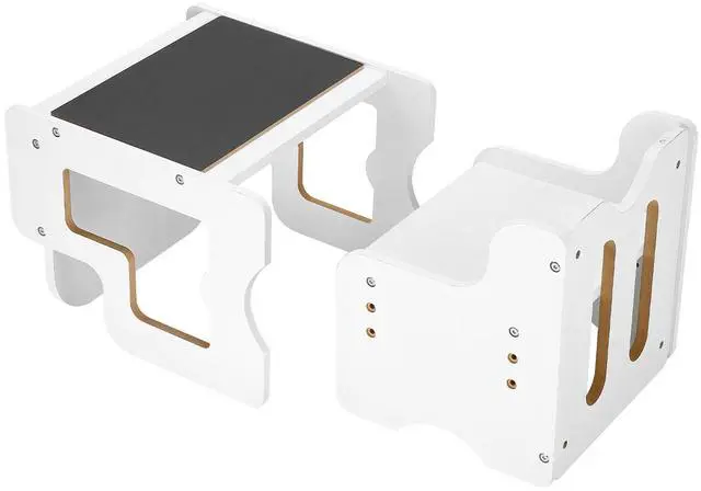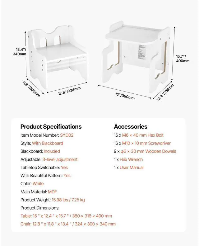 Table: 15 x 12.4 x 15.7 in / 380 x 316 x 400 mm,Tabletop Switchable: Yes,With Beautiful Pattern: Yes,Chair: 12.8 x 11.8 x 13.4 in / 324 x 300 x 340 mm,Color: White,Item Model Number: SYD02,Product Weight: 14.7 lbs / 6.65 kg,Style: With Blackboard,Adjustable: 3-level adjustment,Main Material: MDF,Blackboard: Included