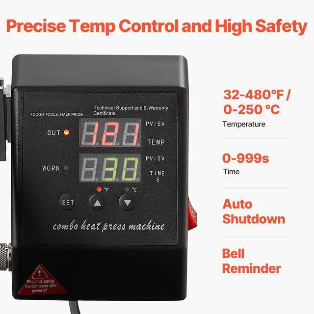 Heating Plate Size: 15 x 15 in / 380 x 380 mm,Time Range: 0-999s,Temperature Range: 32-480 / 0-250 ,Product Dimensions: 19.3 x 15.4 x 18.1 in / 490 x 390 x 460 mm,Net Weight: 32.2 lbs / 14.6 kg,Power: 1400W