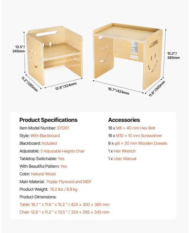 Table: 16.7 x 11.8 x 15.2 in / 424 x 300 x 385 mm,Tabletop Switchable: Yes,With Beautiful Pattern: Yes,Chair: 12.8 x 11.2 x 13.5 in / 324 x 285 x 345 mm,Color: Natural Wood,Item Model Number: SYD01,Product Weight: 15.2 lbs / 6.9 kg,Style: With Blackboard,Adjustable: 3-level adjustment,Main Material: Poplar Plywood and MDF,Blackboard: Included
