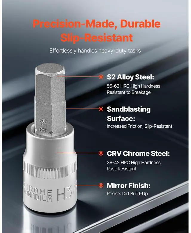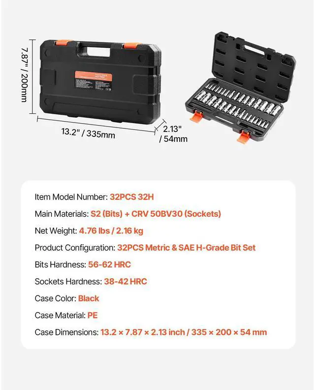 Case Color: Black,Main Materials: S2 (Bits) + CRV 50BV30 (Sockets),Bits Hardness: 56-62 HRC,Sockets Hardness: 38-42 HRC,Item Model Number: 32PCS 32H,Product Configuration: 32PCS Metric & SAE H-Grade Bit Set,Case Material: PE,Net Weight: 4.76 lbs / 2.16 kg,Case Dimensions: 13.2 x 7.87 x 2.13 inch / 335 x 200 x 54 mm
