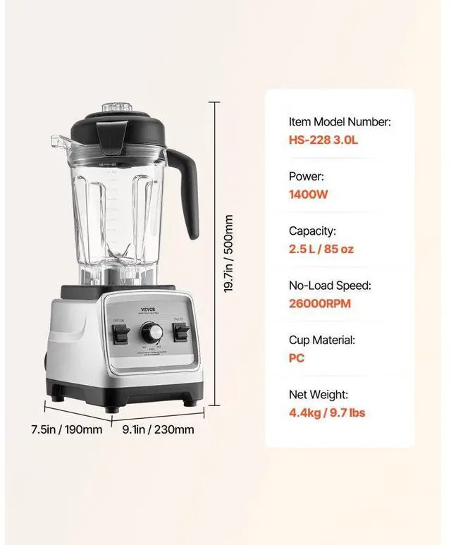 Capacity: 2.5 L / 85 oz,Item Model Number: HS-228 3.0L,Cup Material: PC,No-Load Speed: 26000RPM,Product Dimensions: 230 x 190 x 500 mm / 9.1 x 7.5 x 19.7 in,Net Weight: 4.4kg / 9.7 lbs,Power: 1400W