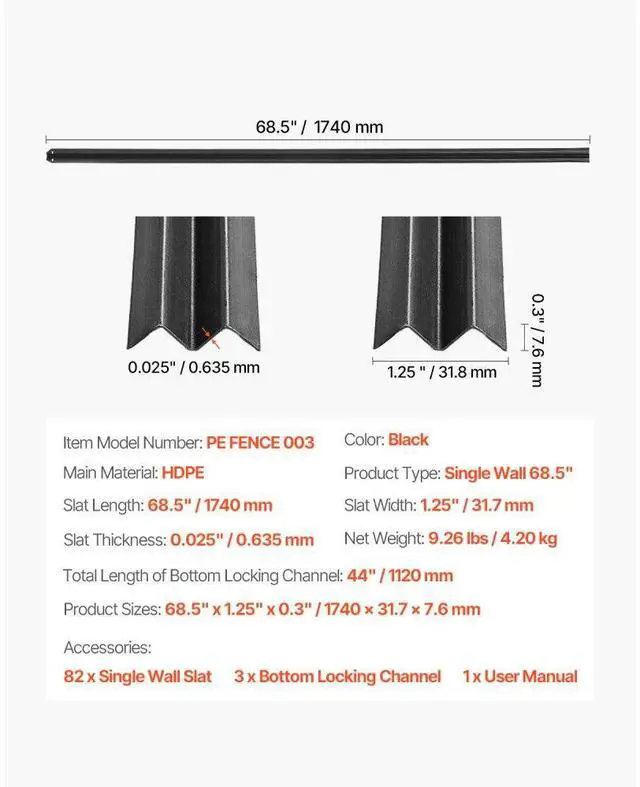 Slat Thickness: 0.025" / 0.635 mm,Product Sizes: 68.5" x 1.25" x 0.3" / 1740 x 31.7 x 7.6 mm,Product Type: Single Wall 68.5",Color: Black,Total Length of Bottom Locking Channel: 44" / 1120 mm,Item Model Number: PE FENCE 003,Slat Length: 68.5" / 1740 mm,Slat Width: 1.25" / 31.7 mm,Net Weight: 9.26 lbs / 4.20 kg,Main Material: HDPE
