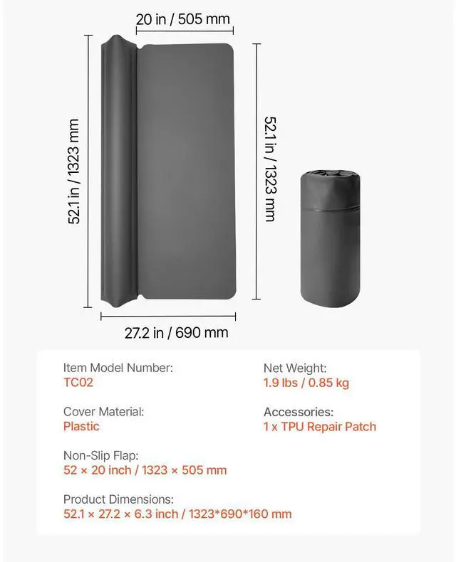 Non-Slip Flap: 52 x 20 inch / 1323 x 505 mm,Item Model Number: TC02,Cover Material: Plastic (TPU),Product Dimensions: 52 x 27.2 x 6.3 in / 1323 x 690 x 160 mm,Net Weight: 1.9 lbs / 0.85 kg